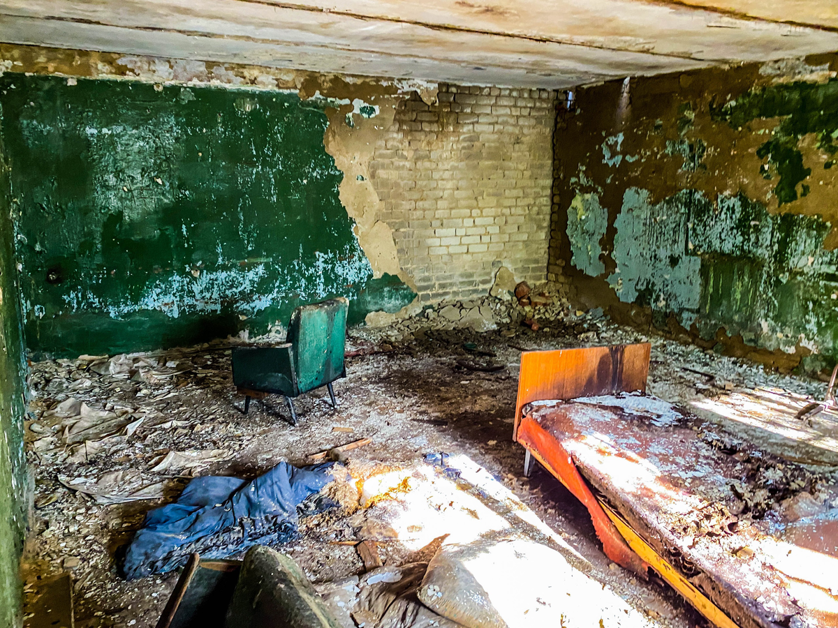 Зашли в бывший обеденный зал заброшенной деревенской столовой. Увидели там старые кресла, кровать и подушки с периной
