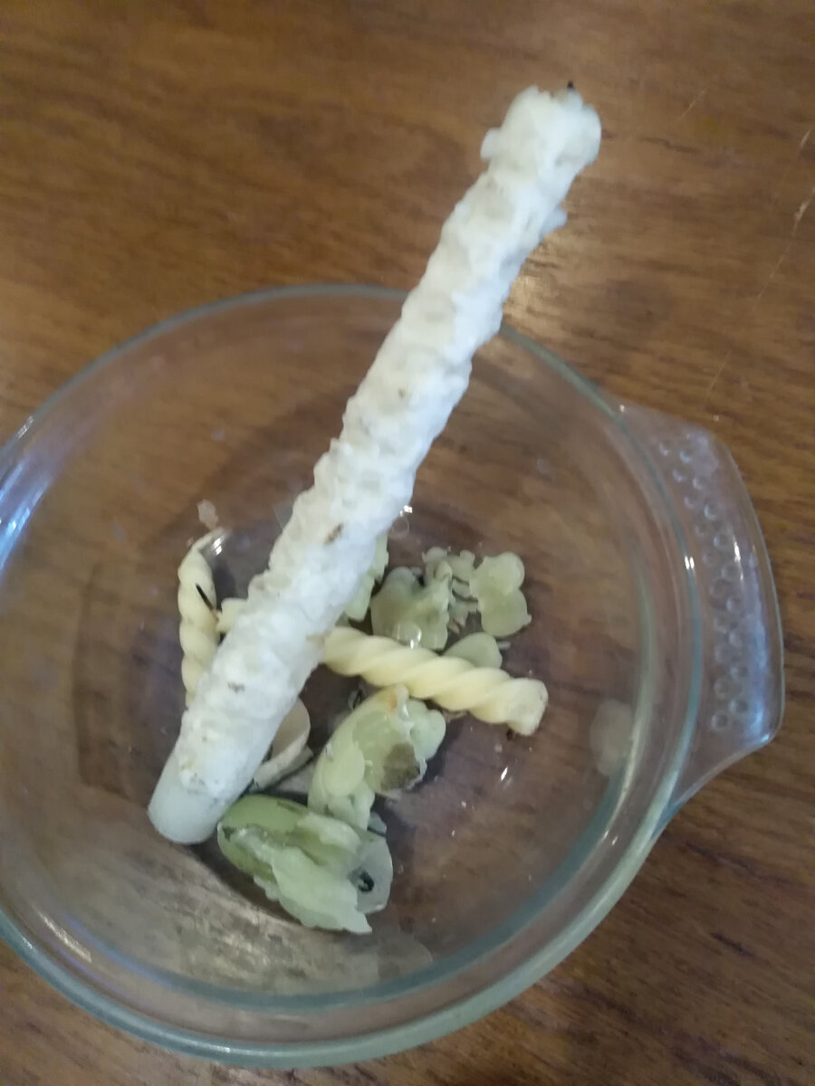 Перед тем, как разливать полученную смесь нужно убрать частички перегоревшего фитиля, которые могли попасть (как у меня на фото выше). И теперь главное - установить фитиль. Чтобы фитиль держался и не утонул до того, как свеча застынет, нужно его к чему-нибудь прикрепить (я взяла вилку и палочку, можно взять зубочистки). Для этого макаем фитиль в смесь и приклеиваем верхним концом к палочке (вилочке, зубочистке). Устанавливаем конструкцию на форме по середине и аккуратно (или не очень аккуратно) заливаем разогретую смесь. Вот такая конструкция получилась: