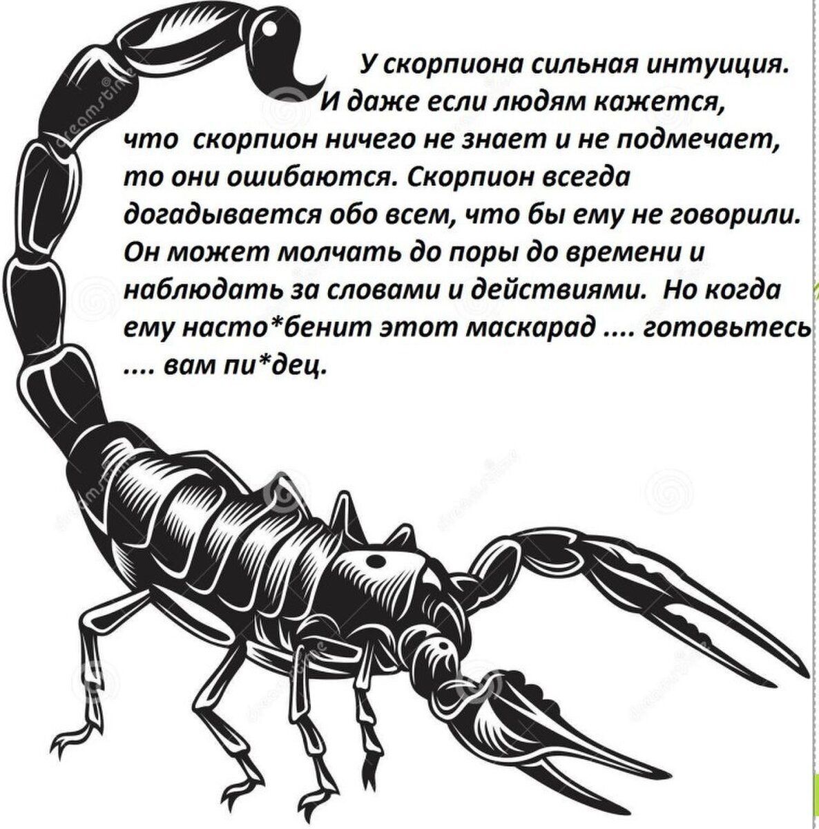Скорпионы не обижаются, они делaют выводы. У Скорпионов нет врагов, у врагов есть они. У них есть свое мнeниe, от которого они не откажутся. У них есть принципы, которых они придерживаются. Скорпионы не улыбаются людям, которые им не приятны. Они не общаются с людьми, которые им не интересны.