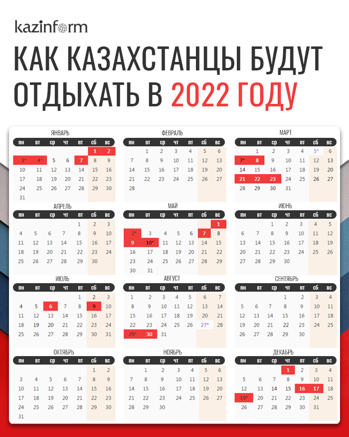 Сколько дней граждане Казахстана отдохнут в 2022 году, читайте в материале корреспондента МИА «Казинформ». Приближается Новый год, и в честь праздника 1 и 2 января в стране официально считаются выходными днями. А в 2022 году эти дни выпадают на субботу и воскресенье. Значит, 3 и 4 числа - понедельник и вторник для казахстанцев станут выходными. В Казахстане отмечаются два религиозных праздника. 7 января следующего года – праздник Рождества Христова выпадает на пятницу, таким образом, казахстанцы будут отдыхать 7 января, включая 8, 9 числа. Включая субботу и воскресенье, казахстанцев в целом ждут 13 выходных в январе. В марте в Казахстане отмечаются два государственных праздника - Международный женский день и Наурыз. Стоит отметить, что в октябре глава Правительства Аскар Мамин подписал постановление о переносе выходных дней в 2022 году. 8 марта 2022 года выпадает на вторник, и согласно постановлению решено, что 5 марта будет рабочим днем, а понедельник, 7 марта - выходным. Соответс