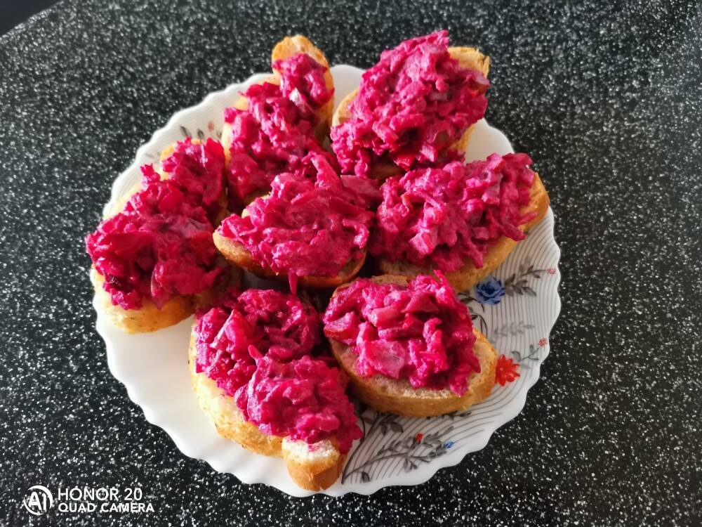 Вкусные овощные бутерброды) Получились внезапно)) тк от селёдки под шубой осталось много лишних овощей. Не пропадать же добру😃 Ингредиенты: Картофель отварной, Свёкла отварная, Морковь отварная, Майонез, Багет Способ приготовления: Овощи у меня были уже сварены и натерты, что очень ускоряет процесс приготовления бутеров. Вам же нужно овощи отварить, остудить, почистить и натереть на тёрке. Все тертые овощи перемешиваем, добавляем майонез. При желании можно добавить немного чеснока, это придаст пикантности блюду. Багет нарезаем на ломтики и намазываем на него наши овощи. Бутерброды готовы 😊 Также как вариант, сверху можно положить кружочки солёного огурца или кусочки селёдки. А можно просто украсить зеленью. Всё зависит от вашей фантазии 😊 Творите 🙃😉 и приятного аппетита ❤️