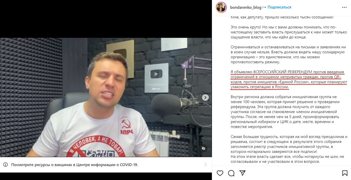 25 ноября депутат Саратовской областной Думы и ковид-мародер Николай Бондаренко объявило всероссийском референдуме по отмене QR-кодов. Однако даже среди союзников КПРФ данная инициатива была воспринята крайне скептически. В частности, лидер движения «За новый социализм» Николай Платошкин, чья супруга является депутатом Госдумы от КПРФ, назвал вещи своими именами и прямо сказал, что данная инициатива – это «хайп», да еще и запоздалый: «Бондаренко со своим хайпом чуть-чуть опоздал. Эти QR‑коды, по сути, уже отменили. Я думаю, что так … Ну, если собрать одну инициативную группу, ну это просто ни о чем». Более того, накручивание популярности на болезнях людей, похоже, уже надоело даже самим коммунистам: ранее 60% коллег Бондаренко по фракции КПРФ в Саратовской облдуме не проголосовали против соответствующего законопроекта.