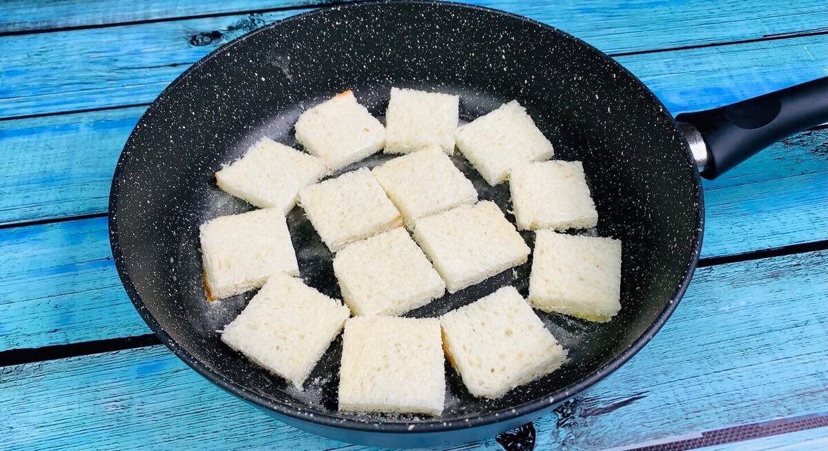 Берём тостовый хлеб, отрезаем края и режем каждый кусок на 4 равные части.