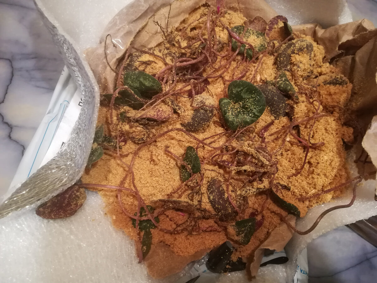 А вот другой заказ с Кавказа пришел сейчас. Но! Я заказывала белый цикламен, а пришел розовый. Клубни уже с листочками и даже цветочками, точнее, бутончиками. Заказ я делала на канале "Цикламен-Клубни.РФ". Мы списались с хозяйкой, обсудили, уточнили, согласовали... И посылка была отправлена. Я ее ждала, ждала, а ее все не было. Хотела зайти на почту, не зашла... Хозяйка написала, что посылка три дн лежит на почте. Посылка на почте, а я на даче... Наконец, сегодня я ее получила. Нервно открывала упаковку прямо на почте, предупредив, что буду писать претензию, если растения погибли. Обошлось! Упаковка была великолепная.