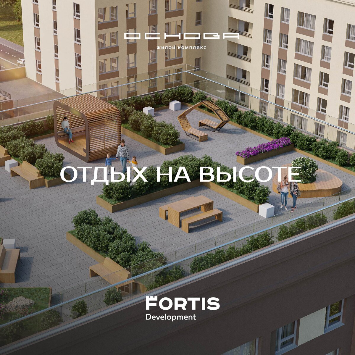 Это настоящая фишка жилого комплекса — редко где можно комфортно отдохнуть на крыше дома, любуясь видами города и кронами деревьев Основинского парка.