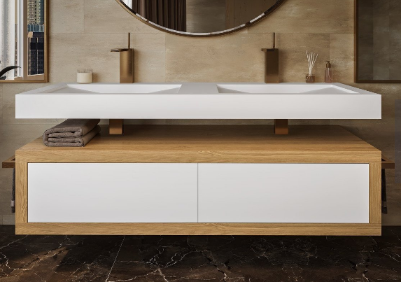 Как правило, тумба из гарнитура для ванной комнаты уже снабжена раковиной. Избегайте ситуации, в которой вам пришлось бы выбирать раковину к уже имеющейся тумбе. В этом случае могут возникнуть сложности: даже если по габаритам они подходят друг к другу, то из-за деталей дизайна при установке могут возникнуть сложности, и даже сама установка не всегда представляется возможной.