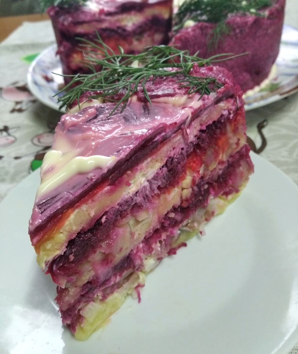 Столько уже написано об этом простеньком и незамысловатом блюде! Казалось бы, элементарно всё - нарезал овощи, яйца, сложил на блюдо, слой селёдки — готово. Но вот уже много лет и даже десятилетий наступление Нового года у нас ассоциируется с двумя салатами — оливье и селёдкой под шубой. И что удивительно! Каждая хозяйка делает эти салаты по-своему, привнося в рецепты что-то своё, индивидуальное. Вот это мой вариант селёдки под шубой. Слои: Картофель ➡️майонез ➡️сельдь ➡️лук ➡️яйца ➡️майонез ➡️свёкла ➡️ картофель➡️майонез ➡️сельдь ➡️лук ➡️морковь ➡️свёкла ➡️майонез ➡️яйцо ➡️картофель. Ингредиенты: Процесс: 2. Если вы купили не готовое филе, а сельдь, то необходимо тщательно выбрать все косточки. Есть вариант — пропустить филе через мясорубку, превратив селёдку в фарш. Тоже выход, но мне больше нравится вариант с мелко нарезанным филе. 3. Репчатый лук нарезаем мелкими кубиками. Можно его заранее замариновать лимонным соком или яблочным уксусом. Но это на любителя. Я не мариную. 4. Натир