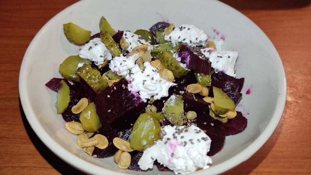 Салат вкусный, необычный. Сделала на пробу из того, что было. Понравилось! Надеюсь и вам придется по вкусу! Ингредиенты: Свекла отварная средняя, Маринованный огурчик, Яблоко зелёное, Соя жареная с солью, Сыр для греческого салата, Семена чиа Способ приготовления: Отварить свеклу, остудить и порезать кубиками. Добавить жаренную сою. Покупала в Ашане в разделе орехи. Порезать кусочками огурчик, яблоко. Добавить в салат. Украсить сыром, чиа. Солить не нужно, так как огурцы и сыр соленый. Заправку я не делала, но при желании можно сбрызнуть оливковым маслом. Приятного аппетита!