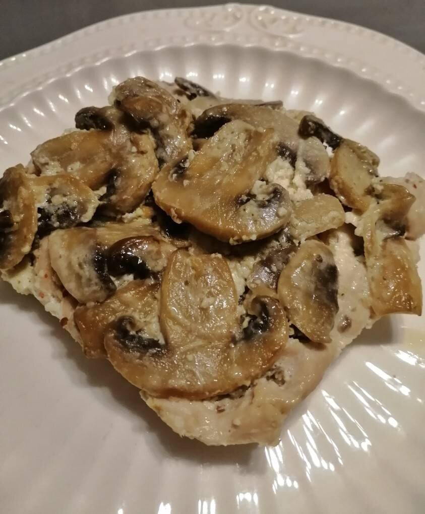 Ингредиенты: филе курицы, шампиньонов, сметаны, сливок , соль, специи, масло для жарки грибов Способ приготовления: Шляпки грибов очистить от кожицы, ножки поскоблить (не мыть!) Нарезать крупными ломтиками, обжарить на масле, добавить сметану, посолить, потушить минут 5. Филе отбить, выложить в форму для запекания, посолить, добавить специи, залить сливками, дать постоять пока жарятся грибы. Грибы выложить сверху на филе, накрыть форму крышкой или фольгой. Запекать при температуре 180 градусов 30 минут.