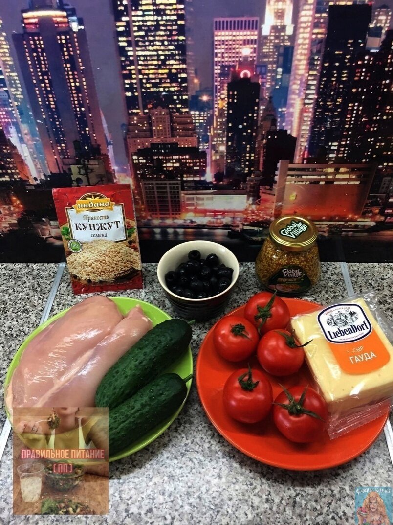 Готовится быстро, а съедается ещё быстрее. Нам понадобится всё, что на фото: 1.Куриная грубка филе-300-400г 2.Огурцы свежие 1-2шт( зависит от размера) 3. Свежие помидоры ( я брала по жестче)-3-5шт 4.Сыр твёрдый, я использовала "Гауда" 5.Масли без косточек ( пол баночки). 6. Для заправки-семена горчицы(горчичный соус), кунжут, соевый соус. Куриное филе нарезаем ломтиками и обжариваем на среднем огне, сразу добавляем соевый соус ( 2-3 с.л), можно добавить приправу для курицы( на любителя) и черный молотый перец. Тем временем, пока наша курочка обжаривается, нарезаем овощи как показано на фото и сыр кубиками. Даем курице остыть. А пока, смешиваем всё в одной посуде ( овощи, сыр, добавляем маслины). После того как куриное филе остыло, добавляем его к овощам и сыру. Заправляем это горчичным соусом (3 ст.л), соевый соус (1 ст.л), кунжут и кому нравится лимон, немного сбрызнуть лимонным соком. Приятного аппетита!)