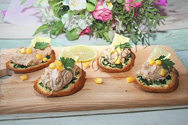 Вместо тунца можно использовать лосося или сайру. С лососем паштет будет посуше на вкус, а с сайрой - нежнее. Категория: Бутерброды, канапе, Рецепты к 23 февраля, Рецепты к пивной вечеринке, Простые рецепты СОСТАВ 8 ломтиков багета 1 банка консервированного тунца 1~2 варёных яйца 70~100г консервированной кукурузы 2 ч ложки лимонного сока (10г) перец ПРЯНОЕ МАСЛО листья с 8~10 веточек петрушки (10г) 2 небольших зубчика чеснока (8г) 2 ст ложки растительного масла (35г) посмотреть калорийность» Поставить духовку разогреваться до t=220°C.