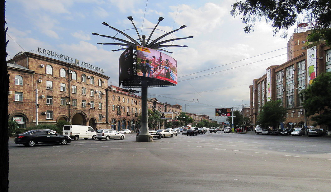 Улица Григория Просветителя в Ереване выводит на проспект Аршакуняц, ведущий в сторону вокзала. Справа виден Дом Печати - стеклянные бастионы типографии "Тигран Великий":