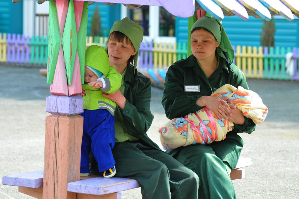 В ситуации с «тюремными» детьми очень много сложностей. Дело в том, что по закону ребенок может находиться в исправительном учреждении при матери только до трех лет. (ЕСЛИ ПРИ КОЛОНИИ ОРГАНИЗОВАНО ПРОСТРАНСТВО ДЛЯ ДЕТЕЙ, но так везет не всем) После этого возраста малыш должен покинуть колонию и дожидаться освобождения матери уже за ее пределами. При хорошем стечении обстоятельств опеку над ребенком оформляют родственники. При плохом — он попадает в детский дом на срок до освобождения матери. Дом ребенка при колонии отчасти напоминает обычный детский дом, но отличается от него в главном: каждый ребенок знает, что у него есть его собственная мама, и это добавляет малышу уверенности в себе. «Посмотрите на наших детей, — однажды поделилась со мной директор Дома ребенка. — Они же каждый — личность! А все потому, что каждый знает свою маму. Этого ребенку ничем не заменишь». Дети содержатся в группах, но мамы имеют возможность ежедневно их навещать. Это совсем небольшое время — б