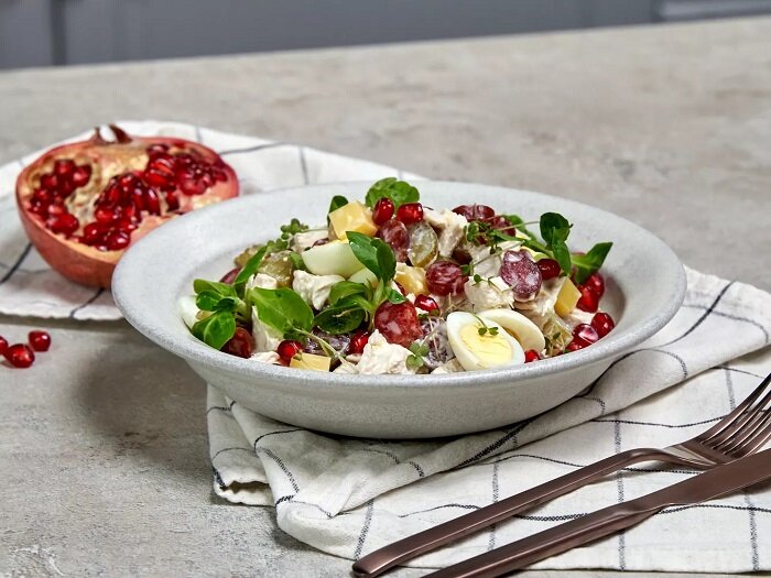 Ингредиенты для этого салата-закуски самые простые, но в сочетании получается невероятный букет вкусов. Так же рекомендую украсить салат гранатовыми зернышками, чтобы он не затерялся среди остальных салатов и закусок. В таком виде он просто будет притягивать внимание. Это действительно очень вкусный праздничный салат. И вот еще рецептики салатов для Вашего новогоднего стола с моего канала на ютуб: Сразу три бюджетных, но очень вкусных салата. Каждый готовится за 5 минут Буду признательна за лайк, комментарий и подписку на мой канал КУЛИНАРНЫЙ ТЕХНИКУМ на ютуб. *** Ингредиенты Для украшения (это не обязательно, но так салат будет смотреться аппетитнее, да и получится вкуснее) Пошаговое приготовление Если филе уже готовое то приготовление салата займет минимальное количество времени. В ином случае поставьте варить курное филе. Для вкуса и аромата не забудьте посолить, добавить листочек лаврушки и пару горошин черного перца. В отдельном ковшике поставить варить яйца. Сваренные вкрут