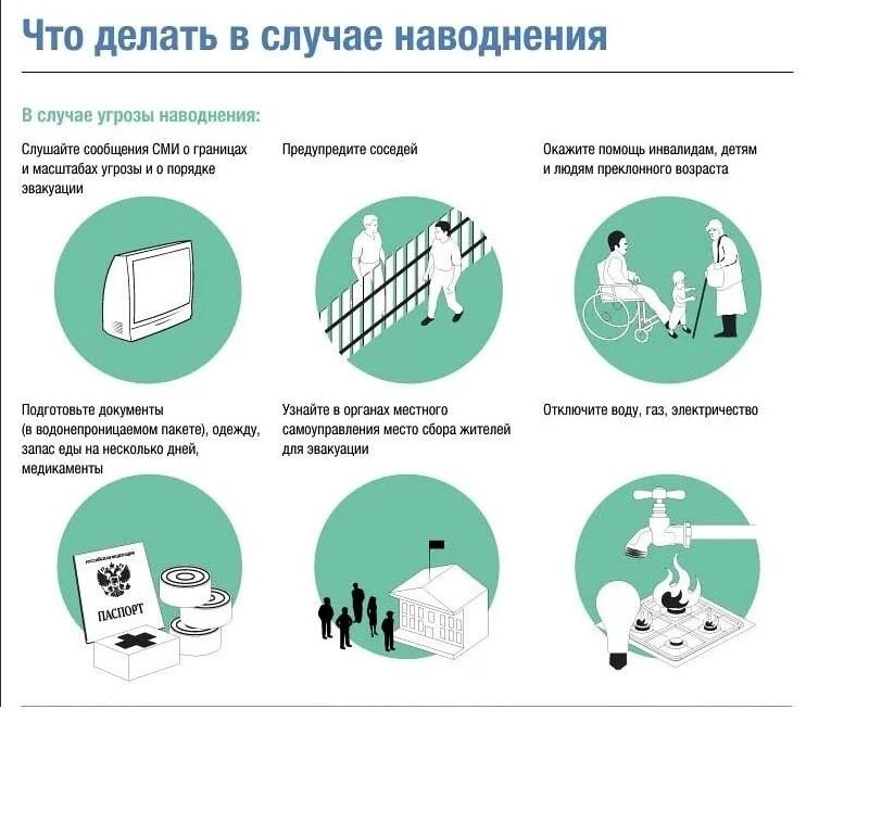 При угрозе затопления или наводнения, прежде всего, необходимо отключить воду, газ, электричество. Затушить огонь в печи.