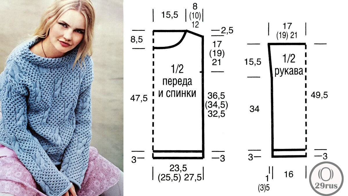 Изысканное сочетание мотивов в виде “кос и рельефной фактуры, выполненной узором “соты”, превращает пуловер с широким воротником и отделкой руликом по низу и краю рукавов в нечто совершенно особенное. Размеры: 36/38, 40/42, 44/46 Вам потребуется: пряжа (100% шерсти; 80 м/50 г) - 750 (800/850) г. голубой; спицы № 5 и 5,5; круговые спицы № 5. Лицевая гладь: лицевые ряды - лицевые петли, изнаночные ряды - изнаночные петли. Основной узор: количество петель кратно 28 + 16 п. Вязать по схеме 1. На схеме даны лицевые ряды. В изнаночных рядах петли провязывать по рисунку. В ширину начинать с петель перед раппортом, повторять раппорт, заканчивать петлями после раппорта. В высоту повторять с 1-го по 52-й р. Отделочный узор: ряды в прямом и обратном направлениях (количество петель кратно 4). Вязать по схеме 2. На схеме даны лицевые ряды. В изнаночных рядах петли провязывать изнаночными. В ширину повторять раппорт. В высоту повторять с 1-го по 4-й р. Отделочный узор: круговые ряды (количество пете