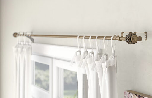 - Круглый. Самый популярный тип. Состоит из штанги для портьер, может дополняться перекладиной для тюля. Часто декорируется эффектными наконечниками. Может быть прямым и угловым. Это самая универсальная модель, поскольку возможны разнообразные виды крепления штор к карнизу: на кольцах, люверсах, крючках, завязках, кулиске, петлях.