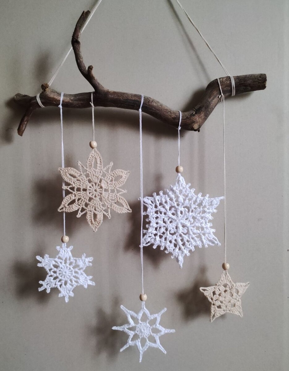 Сделала подвесы с бусиной на каждую снежинку и привязала к коряге. Декор готов.