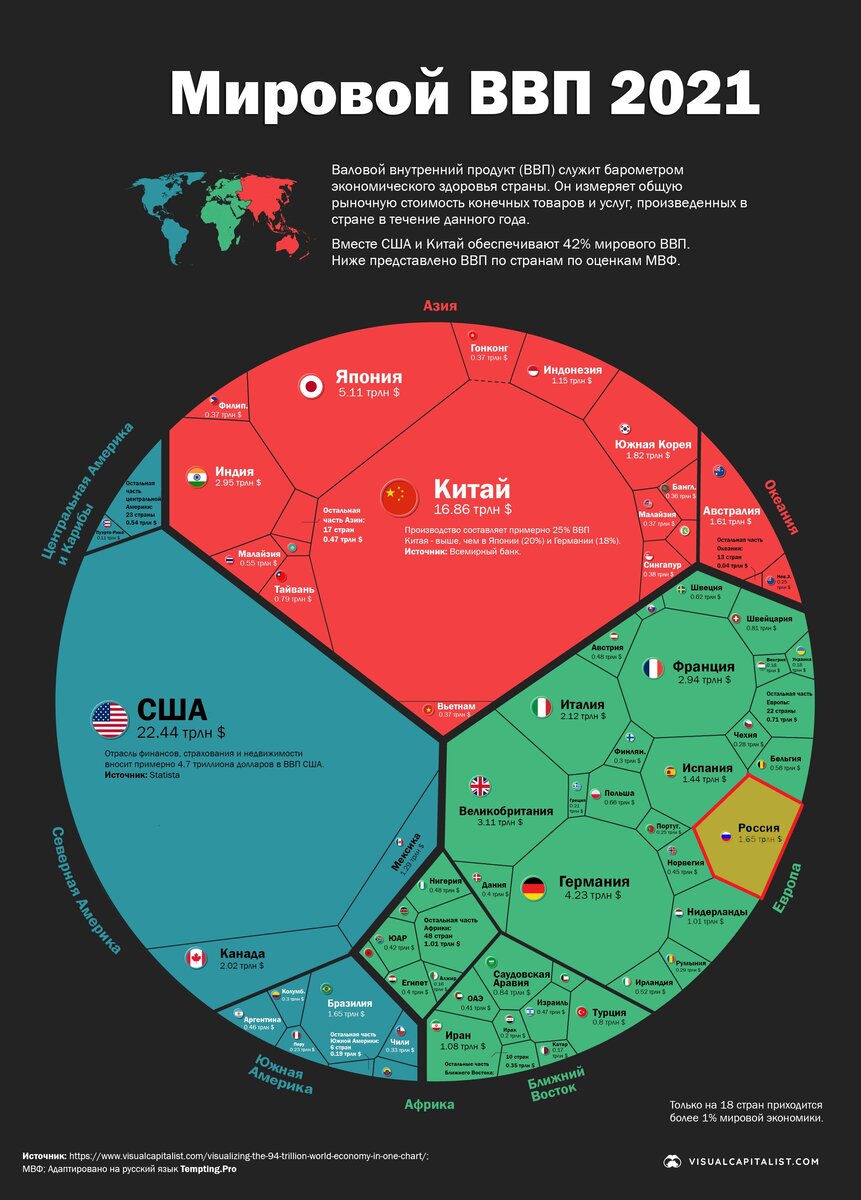 В этой публикации я вам наглядно покажу, какую долю занимает российская экономика в экономике мира и как она соотносится с экономикой других стран. Все это можно увидеть на инфографике ВВП-2021, представленной VisualCapitalist (Россию выделил). Итак, мировой ВВП в 2021 году, согласно прогнозу, составит около 94 трлн. долларов. На инфографике видно, как эта сумма распределяется между континентами. Вот так выглядит первая десятка стран-лидеров по объему ВВП. Почти четверть мирового ВВП приходится на долю США (22,9 трлн. долларов или 24,4%), на втором месте находится Китай (16,9 трлн. долларов или 17,9%). Вместе США и Китай обеспечивают 42,3% мирового ВВП (существенно более трети). Лидерами по ВВП на европейском континенте являются Германия (4,2 трлн. долларов или 4,5%), Великобритания (3,1 трлн. долларов или 4,5%) и Франция (2,9 трлн. долларов или 3,1%). Экономика России обеспечивает 1,65 трлн. долларов или 1,7% мирового ВВП. По этому показателю Россия входит только во вторую десятку стр