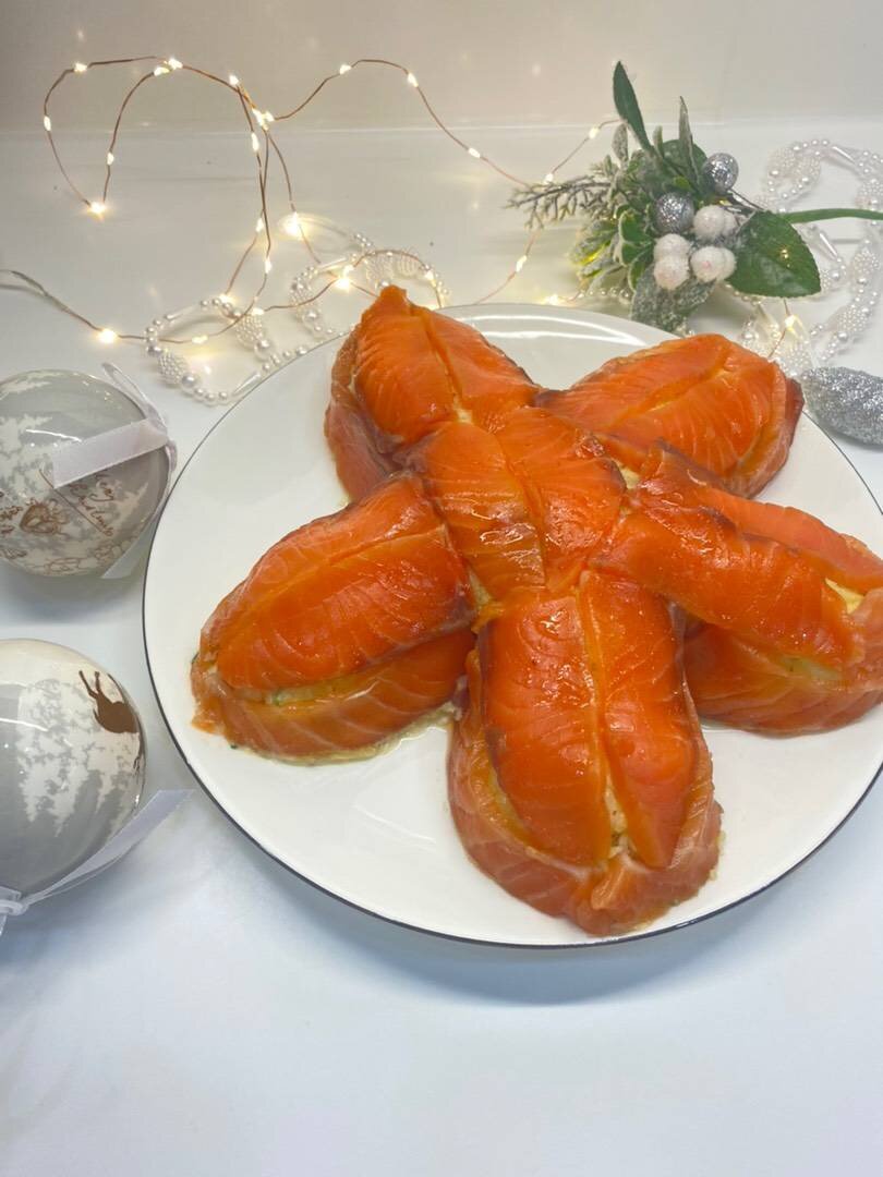 Этот салат не оставит ваших гостей равнодушными. Нежный, вкусный и эффектный салатик вам в ленту. Ингредиенты: красной рыбы, сыра, яйца, больших картофелины, свежих огурца, луковицы, соль, перец, майонез Способ приготовления: Свежие огурцы разрезать вдоль полосками и выложить на блюдо в виде звезды. Яйца отварить, натереть на терке смешать с 1 ч.л майонеза и аккуратно выложить поверх огурцов. Лук мелко нарезать и выложить сверху. Красную рыбу отрезать тонкими полоскать для украшения салата, а оставшуюся рыбу мелко нарезать кубиками и выложить следующим слоем. Сыр натереть на мелкой терке и выложить поверх рыбы. Далее выложить натертые на мелкой терке остатки свежих огурцов. Картофель отварить и натереть на мелкой терке перемешать с майонезом и аккуратно выложить следующим слоем. Поверх выложить полоски из красной рыбы, формируя морскую звезду. Я полоски поделила на 2 части. Каждый слой смазываю майонезом, тонким слоем. Приятного аппетита 😋 С наступающим Новым годом 🎄