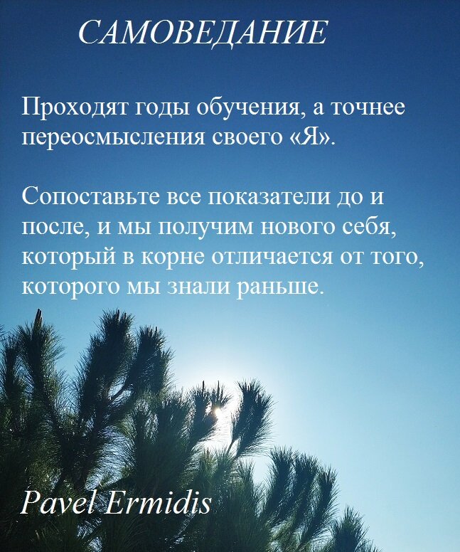 Ведь ещё недавно мы просто жили, строили планы по созданию быта, делая карьеру, думая о семье, потом о внуках, одним словом проводили свои дни в обычном для современного человека ритме жизни, не подозревая и не задумываясь о смысле жизни, кто мы такие, зачем мы здесь. Наступает время и подобные вопросы неизбежно возникают, но останутся ли силы и то же время на получение ответов. Просто оглянитесь, как меняемся мы, как всё меняется вокруг нас. Определены новые, соответствующие цели, которые касаются не только бытия, но самой сути, что дальше, куда и откуда ведут дороги жизни. Проходят годы обучения, а точнее переосмысления своего «Я». Сопоставьте все показатели до и после, и мы получим нового себя, который в корне отличается от того, которого мы знали раньше. Продолжение следует...