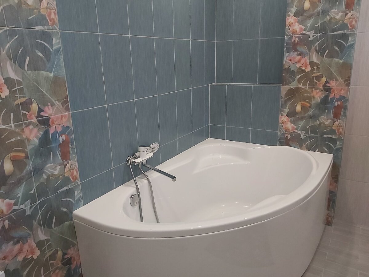 Дизайн ванны! Синий с бежевым. Декор-попугаи ара в джунглях. 6м², 2 окна и 2 полотенцесушителя! Как вам? Нравится? Напишите в комментариях. А какая у вас ванна? Или какую вы хотели бы? Желаю всем успехов в ремонте!) #дизайн ванной комнаты #ванная комната #плитка #плитка для ванной #строительство #ремонт своими руками #ремонт квартир