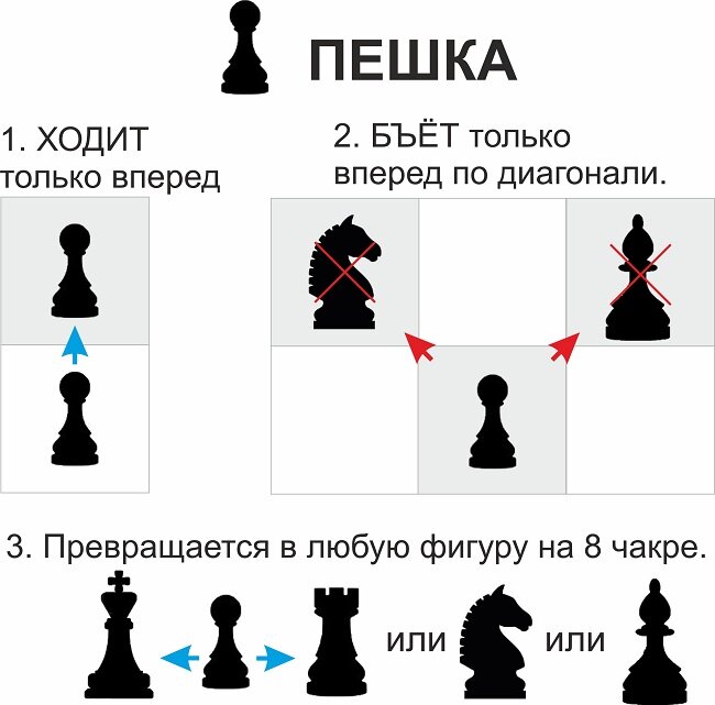 Пешка ходит вперед на одну клетку, как в классических шахматах. Она бьет вперед, по диагонали на одну клетку, как в классических шахматах.