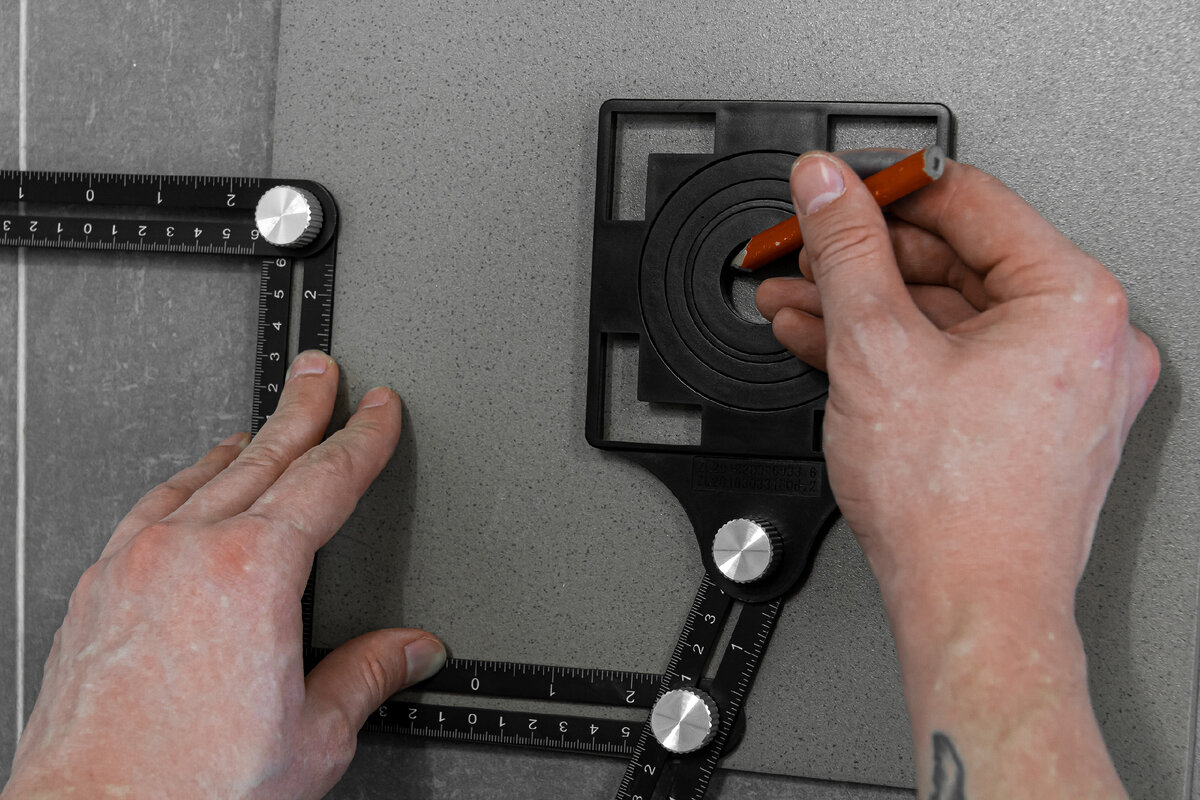 Выходы кабелей, труб, вентканалов, антенн и других инженерных коммуникаций – настоящая головная боль для плиточника, особенно для не очень опытного. Но у нашей компании есть решение – cовременное и необычное! Локатор отверстий от компании 3d Krestiki – замечательный инструмент, заметно упрощающий облицовку проблемных мест. Это складная линейка для разметки мест сверления, которая поможет с первого раза точно локализовать место будущего отверстия и не испортить плитку. Как им пользоваться? Очень просто. Нужно сделать так, чтобы отверстие на локаторе совпало с фитингом, зафиксировать это положение с помощью подвижных линеек, а затем перенести локатор на плитку, подготовленную для выпиливания. С помощью этого приспособления можно сверлить отверстия диаметром 24, 40, 45, 55 и 75 мм. В комплекте не предусмотрено насадки для подрозетника, однако, смекалка подсказывает, что его вполне можно выпилить, используя кольцо максимального диаметра. Для этого нужно наметить центральную ось и, сориент