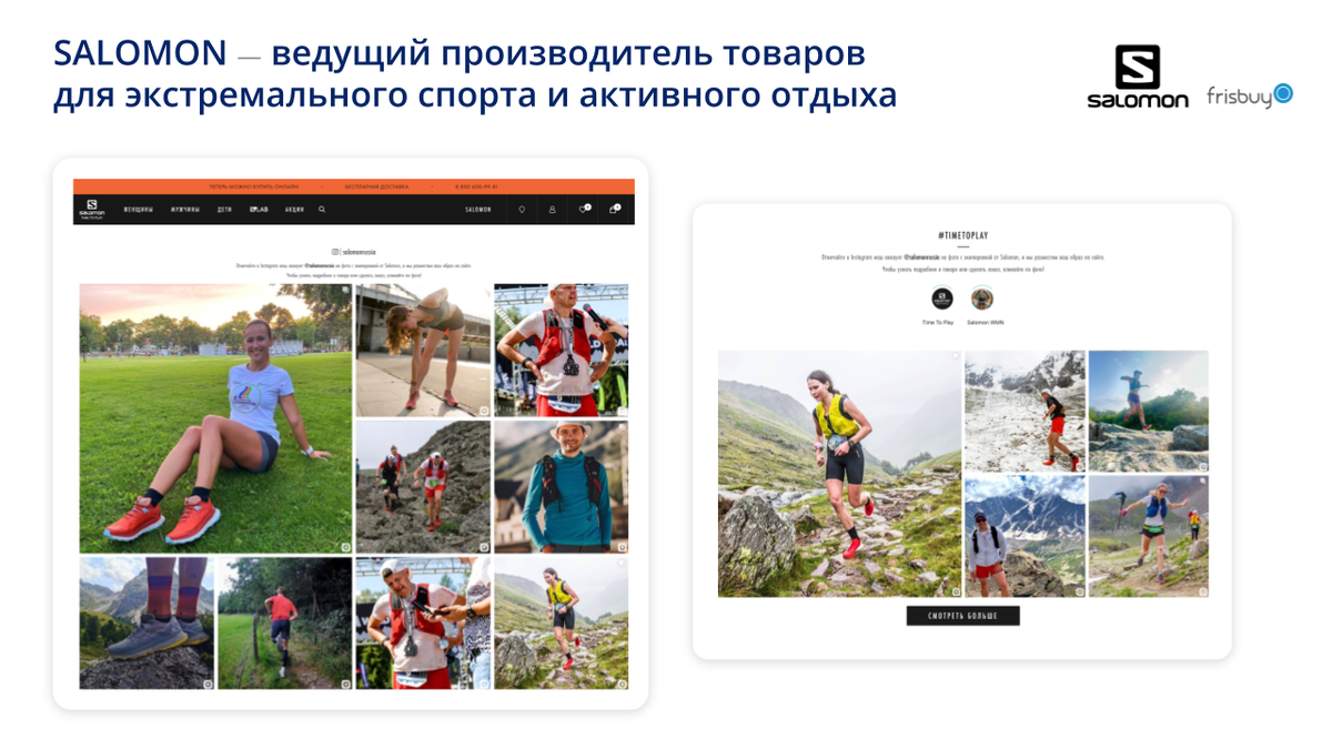 Мы в Salomon убеждены, что залог успеха бренда в ближайшее десятилетие — это выстраивание искренних взаимоотношений с клиентами, улучшение пользовательского опыта и высокая лояльность клиентов. Инструменты social commerce, которые предоставляет Frisbuy- одни из основных факторов, позволяющие достичь данных целей.