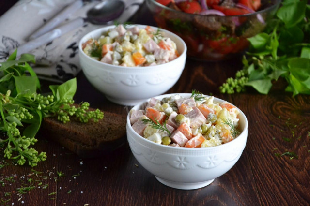 Вкуснейший, самый лучший среди всех, на праздничный стол! Классический оливье с колбасой и зеленым горошком - простой и вкусный салат советских времен, который быстро и легко готовится. Заправлять его можно майонезом, сметаной или натуральным йогуртом, а подавать - на обед или ужин, в будни и праздники. ИНГРЕДИЕНТЫ: Как сделать оливье с колбасой? Подготовьте необходимые ингредиенты. Картофель и морковь отварите заранее и остудите. Куриные яйца отварите вкрутую, также охладите их и очистите от скорлупы. Вареную колбасу можете взять любую, на свой вкус. Огурцы могут быть соленые или маринованные, это не критично. Из банки зеленого горошка слейте жидкость, а сам горошек откиньте на дуршлаг и дайте полежать какое-то время. Это хорошо делать, чтобы салат не "поплыл" - мы даем всем излишкам влаги высохнуть. Вареную колбасу нарежьте кубиками. Я взяла молочную колбаску. Вареную и охлажденную морковь очистите от кожицы и нарежьте средними кубиками. Старайтесь все ингредиенты нарезать кубиками о
