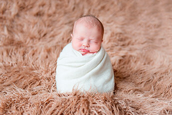 - Уложите малыша по центру, левую ручку поднимите вверх, так, чтобы кулачок оказался в верхней складке пеленки.