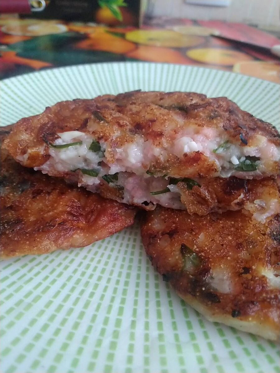 Подойдёт к завтраку, перекусу. Начинка любая, мясная, овощная или ягодно-фруктовая!!! #перекус #оладьи #меню #вдохновение Ингредиенты: кефир, яйца, плав. сырка (на тёрке), Соль, соды, Манка , Колбаска (на тёрке), Лук репчатый, чеснок, зелень, Мука Способ приготовления: В кефир сыпем соду, ждём минут 5-7, далее добавить яйца, соль, все перемешать. Сыпем манку, и даём постоять минут 10-15, чтоб манка разбухла. Сыпем муку. Перемешать. Добавить начинку: сырок, колбаска, зелень, лук, чеснок. Тщательно перемешать и дать отдохнуть минут 10. Жарим под крышкой. Готово!!!