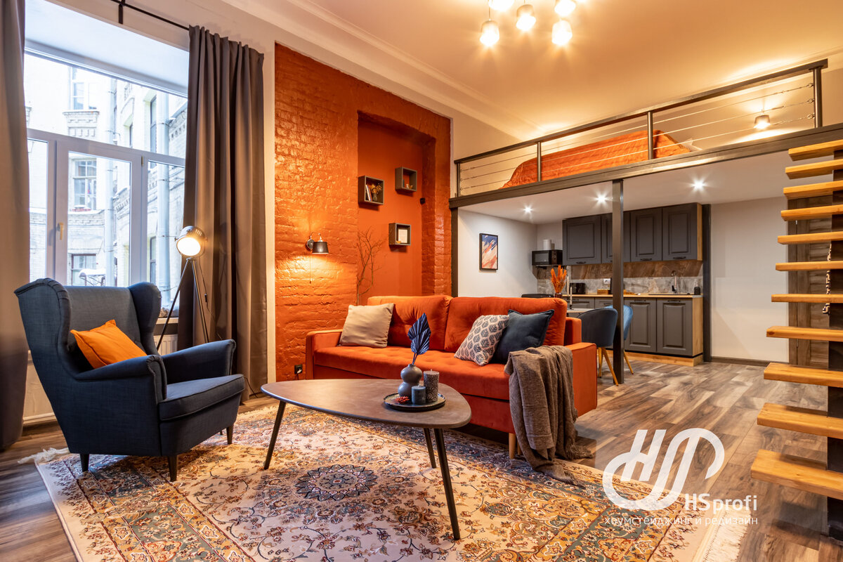 В Санкт-Петербурге на одни апартаменты под посуточную #аренду стало больше. Среди прочих на рынке их выделяет яркий апельсиновый цвет и необыкновенная атмосфера уюта, которую с помощью хоумстейджинга создала команда #HSprofi. На момент, когда к нам обратилась клиентка, в квартире уже был выполнен ремонт. Кардинальных перемен не планировалось, нужно было наполнить пустое пространство, создать уютное и комфортное жилье для будущих гостей. Цветовое решение стен изначально нам понравилось, поскольку яркие краски актуальны, как для серой погоды Петербурга, так и для посуточной аренды. Среди десятков одинаковых и часто безликих объявлений, фотографии с яркими деталями и интересным декором, как правило, визуально выигрывают. Необходимо было разбавить рыжий цвет, немного утихомирить его пыл, подобрав цвет-компаньон. Идеально подошел синий. Далее мы обдумали стилевое решение. Пространство отдаленно напоминало стиль лофт — брутальный и строгий. Для посуточной аренды лофтовый интерьер мало подх