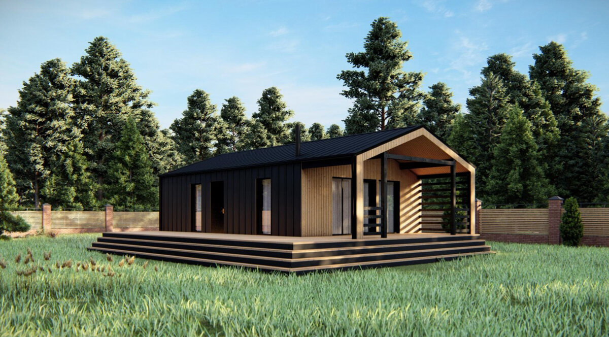 Внешне очень похож на оригинальный ДубльДом. Проект стильного барнхауса площадью 64м2 с террасой.
