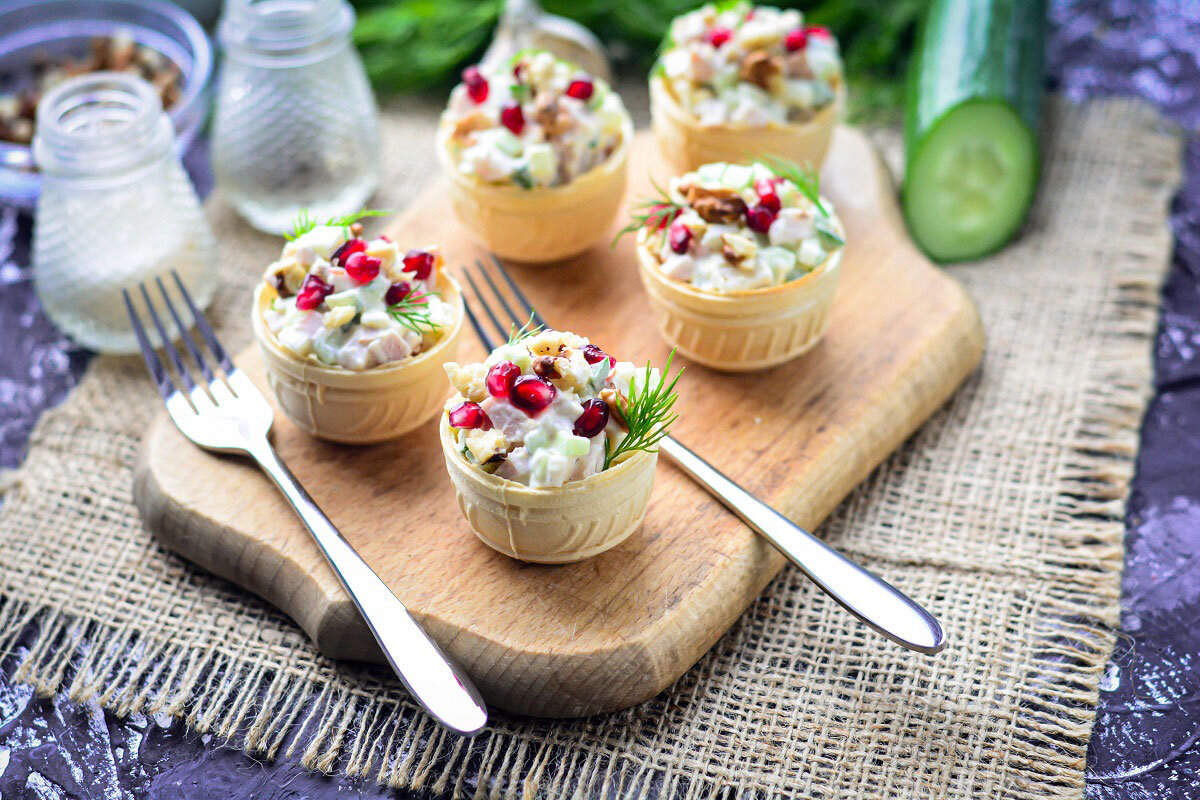 Почему же взрыв вкуса? Потому что набор ингредиентов на первый взгляд совершенно несовместим, но стоит попробовать ложечку салата и остановиться уже будет просто невозможно! Пробуем? ИНГРЕДИЕНТЫ: Ветчина -250 грамм Огурец свежий-1-2 штуки Яйцо куриное вареное - 3 штуки Орехи грецкие-30 грамм Зерна граната-30-50 грамм Чеснок-2 зубчика Майонез - по вкусу Зелень - по вкусу Для подачи: Тарталетки - 6-8 штук Начинаем: 1. Подготовьте все необходимые ингредиенты. Яйца заранее отварите и остудите. Очищенные яйца, огурцы и ветчину нарежьте мелким кубиком. 2. Добавьте мелко рубленные орехи и чеснок. 3. Заправьте майонезом, перемешайте и посолите по вкусу. Разложите салат в тарталетки. 4. Украсьте зернами граната и свежей зеленью! Можно подавать к столу! Приятного аппетита! Понравился рецепт? Жми лайк! #доставка