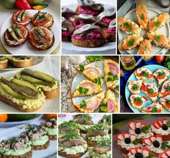 1. ломтики черного хлеба + 150 г творожного сыра + помидор + 150 г шпротов + зелень 2. Свекла, натёртая на тёрке + Сельдь слабосоленая + Хлеб ржаной, обжаренный на растительном масле + Чеснок + натёртый Сыр + Майонез + Зелень + Лук ⠀ 3. Хлеб тостовый + натёртый Авокадо + натёртый Сыр плавленый + натёртое на тёрке вареное Яйцо куриное + Лосось малосольный + Соль - по желанию + Перец черный +Лимонный сок, чтобы авокадо не потемнел + Майонез или натуральный йогурт ⠀ 4. Банка шпрот в масле + батон хлеба + яйцо отварное натёртое на тёрке - 5 шт + чеснок - 5 зубков + майонез + огурец соленый или маринованный + масло растительное для обжарки батона ⠀ 5. Хлеб поджаренны + Яйцо куриное отварное натёртое + Крабовые палочки натёртые + Майонез + Соль и перец + Лук красный + Зелень - для украшения ⠀ 6. Батон пшеничный + Яйца куриные + Сырок плавленый + Грудка куриная копченая + Помидоры черри + Майонез +Чеснок + Горчица зерновая + Растительное масло для обжарки + Петрушка ⠀ 7. авокадо + творог (м