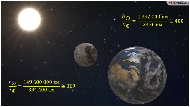 Покрытие Солнца Луной называется солнечным затмением. Происходит оно потому, что угловые размеры дисков Солнца и Луны для наблюдателя с Земли кажутся одинаковыми. Объясняется это тем, что диаметр Луны примерно в 400 раз меньше диаметра Солнца. Но в тоже время она в четыреста 400 раз ближе к Земле. Это приводит к тому, что Луна может полностью покрыть яркую поверхность Солнца, оставив при этом видимой лишь его атмосферу.