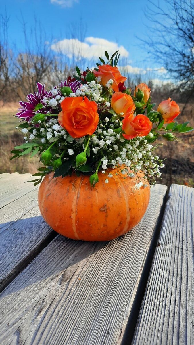 Вот один из способов от мастерской 'Огненное дело" Берем тыкву, вырезаем в ней отверстие под стакан и вычищаем мякоть. Мастер хотел сохранить тыкву, поскольку из них делают даже фляги. Но процесс сушки не удался, не были соблюдены условия. Зато получилась красивая композиция. Цветы были поставлены в стакан в раствор: глицерин и вода смешиваются в одинаковых пропорциях. Они красиво засохли и не ломаются. Но не все цветы можно сохранить: хризантемы повели себя плохо. О том, как правильно сушить цветы рассказывается здесь ниже видео - процесс показан во всех подробностях: Канал Зелимхана Евлоеваhttps://www.youtube.com/channel/UC31hoAuJk82TRzoYBtldMhg/videos Магазин на Ярмарке мастеров https://www.livemaster.ru/-kovka- Инстаграм https://www.instagram.com/fiere_work/