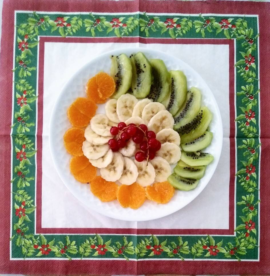 #фрукты #десерт #новыйгод Нет ничего лучше для застолья, нежели фруктовая нарезка, так как она радует глаз и придется по вкусу всем гостям. Просто, легко и вкусно 🎄🎄🎄🎄 Ингредиенты: киви, мандарин, банан, красная смородина Способ приготовления: Фрукты помыть. Почистить. Нарезать произвольно. Выложить на тарелку. Можно посыпать орешками. Приятного аппетита!!!!