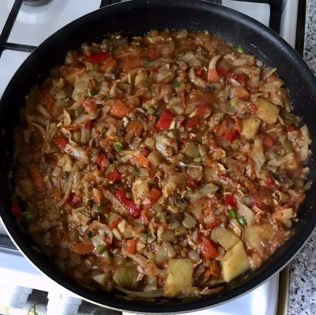 Ингредиенты: луковицы, морковка, кабачок, картофелин, баклажан, средней капусты, консервир. помидоров или 3-4 свежих, болг. перца, том. пасты, овощного кубика, чеснока, Соль, перец, лавр. листики, прованские травки, зелень, фенхель Способ приготовления: Подготовим продукты. Нарежем кубиком кабачок, баклажан, перец, лук. Морковку натрём произвольно. Баклажан посолим и отожмём лишнюю воду. В большую сковороду с растит. маслом отправляем лук, когда он немного обжарится, морковку. После неё- болгарский перец. Пусть пожарится на небольшом огне минут пять. К овощам добавляем баклажан, снова минут пять обжарим и добавим кабачок. После него- картошку кубиком и капусту, перемешаем и накроем ненадолго крышкой. Капуста должна стать мягче, теперь дольём немного кипятка, снова накроем крышкой. Пусть потушится на маленьком огне. Периодически перемешиваем. Когда овощи станут мягкими, добавим лавр. лист, сушёную зелень, соль, перец, помидоры из банки, овощной кубик, чеснок, всё, что вам нравится. След