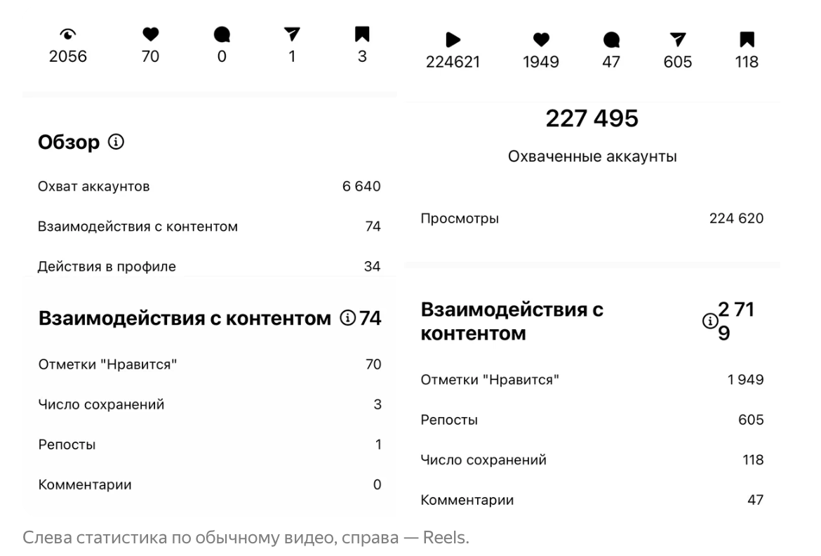 Живой пример из нашей практики — продвижение в т.ч. с помощью Reels клиента, работающей в медицинской сфере: средний охват аккаунтов обычного видео — 6,5 тыс., взаимодействий — 74; а вот для видео Reels цифры вырастают до 227,5 тыс и почти 3 тыс. соответственно.