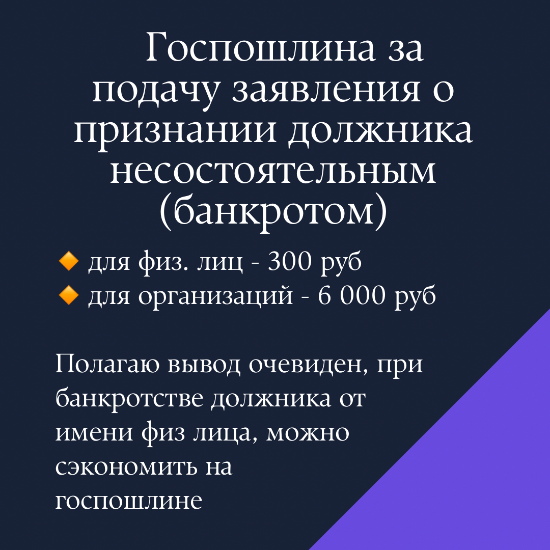 Здравствуйте!!! Вопрос экономии при взыскании денег, всегда являлся актуальным В наше не простое время, предприниматели экономят на всем, в том числе и на судебных издержках, поэтому «Ведение бизнеса необходимо продумывать в мелочах» Поэтому, экономически целесообразнее банкротить должника от физ лица, поскольку можно сэкономить на госпошлине в 20 раз или 5 700 руб На первый взгляд не большая экономия, но таких расходов будет не мало в ходе процедуры банкротства должника и в конечном итоге получается кругленькая сумма, которую можно было бы сэкономить на банкротстве должника если знать на чем экономить Поэтому рекомендую привлекать квалифицированных специалистов для ведения банкнотных дел, поскольку стоимость юридических услуг обойдётся Вам дешевле допущенных ошибок и неразумных трат на процедуру банкротства #банкротсво #должник #юрист #арбитражныеспоры #взысканиезадолженности#юрист #юридическаяпомощь #юридическаяконсультация