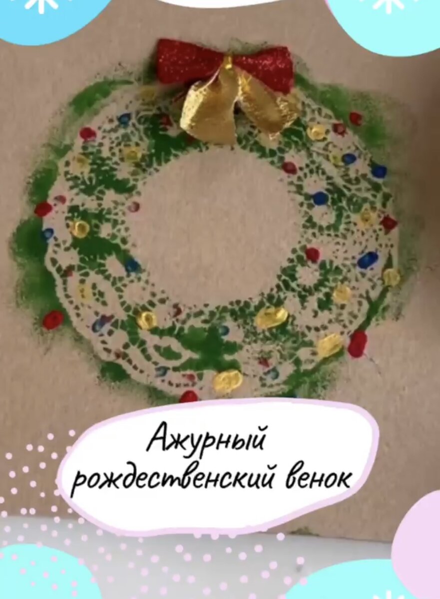 Для поделки нам понадобится: картон, ажурная салфетка, краски, ножницы, ватные палочки. Шаг первый. Прикладываем салфетку и отпечатываем зеленой краской. Шаг второй. Убираем салфетку Шаг третий. Ватной палочкой делаем украшения Шаг четвертый. Приклеиваем бант. А теперь список, что нужно не забыть сделать перед новым годом. Любим и сохраняем 💞 1. Сделать новогодний венок ( на видео самый простой пример) 2. Вырезать снежники и украсить окно 3. Сделать новогоднюю открытку 4. Устроить день обнищаний 5. Нарисовать на окнах 6. Устроить вечер настольные игр с семьей и друзьями 7. Устроить вечер обнимашек 8. Испечь имбирные пряники 9. Прочитать новогоднюю книжку 10. Сделать снеговика 11. Покататься на санках, лыжах 12. Сделать искусственный снег 13. Устроить день поцелуев 14. Сходить на новогоднюю ярмарку 15. Поздравить нянь или воспитателей самодельной открыткой 16. Сделать новогоднюю поделку 17. Выучить новогодний стишок и рассказать деду морозу или родителям 18. Станцевать под новогоднюю п