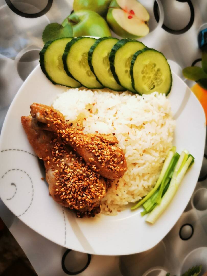 Оригинальный рецепт у Галины @gala1vara Просто, вкусно, спасибо Вам🙌 Всех с наступающим новым годом 🎄 Желаю вкусных блюд на столе и самого крепкого здоровья ☺️ #новыйгод Ингредиенты: риса, Голени куриные, Соль , Соевый соус, Лук зелёный свежий, Огурец свежий, Масло кунжутное 5 капель в рис, Кунжутные семена Способ приготовления: Приготовим наши ингредиенты 🙌 Отварим рис как написано на упаковке (в подсоленную кипящую воду добавляем рис, варим его 25 минут, готовится как гречка 😉) как сварится рис я добавляю несколько капель кунжутного масла и тщательно перемешиваем 🙌 Окорочка мы замаринуем в соевом соусе оставим их на 30 мин -1 час. Обжарим кунжут до золотистой корочки 👌 Обжариваем голени с двух сторон до образования золотистой корочки, Сначала я их хорошо прокипятила в сковородке, затем вода выкипела я пожарила на растительном масле. Накладываем наш рис, окорочка, нарезанный огурец и лук и посыпаем всё нашими семенами кунжута, приятного аппетита ☺️