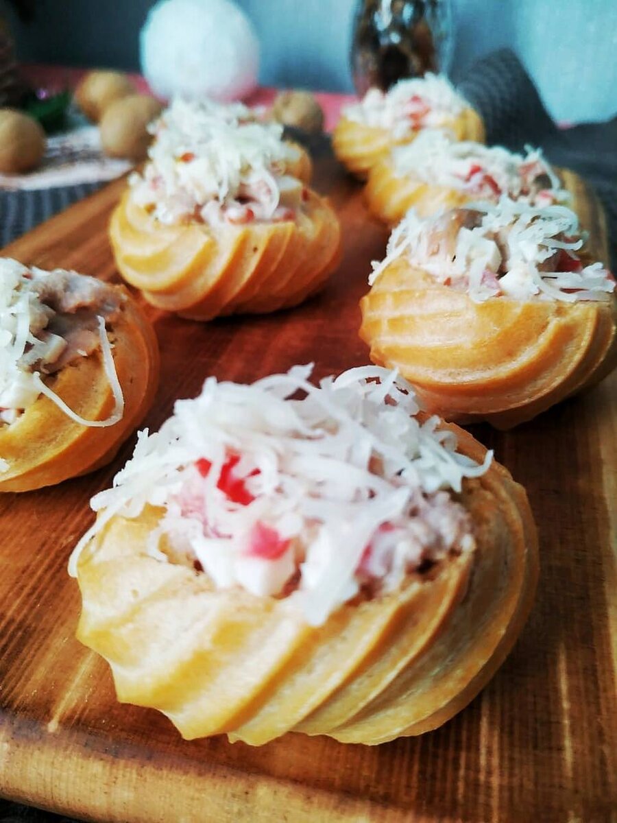 Красиво оформленные закусочные профитроли с консервированным тунцом украсят любой праздничный стол. Пирожные получаются не только оригинальные, но и очень вкусные. Начинку можно приготовить не только рыбную, но и мясную, сырную или овощную. Фантазируйте и удивляйте своих гостей! #новыйгод Ингредиенты: Для теста:, воды,, соли,, сливочного масла,, муки,, крупных яйца, 1 яичный белок, Для начинки:, Тунец в собственном соку , Крабовые палочки , Помидор , Яйцо отварное , Перец черный молотый , Майонез , Сыр для присыпки сверху Способ приготовления: Поставьте на огонь кастрюльку с водой, солью, сливочным маслом, нарезанным на кусочки, и нагревайте. Когда вода закипит, масло уже должно растаять. Добавьте в воду сразу всю муку и очень быстро, за 1–2 минуты, замесите тесто деревянной лопаточкой. Должен получиться большой красивый колобок. Снимите кастрюлю с огня и дайте тесту остыть. Добавьте одно яйцо и интенсивно мешайте. Тесто начнет расслаиваться, но вам нужно сделать его снова однородным