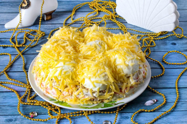 Нежный, вкусный, красивый, праздничный, из простых продуктов. Салат Сугроб отличается необычным оформлением, но готовится из самых обычных продуктов. По виду он напоминает снежные сугробы, а потому идеально смотрится на новогоднем столе или на любых зимних праздниках. ИНГРЕДИЕНТЫ Как сделать салат Сугроб? Подготовьте продукты. Заранее отварите овощи и яйца. Для этого налейте в кастрюлю воду, слегка посолите ее и дайте закипеть. Опустите в воду предварительно промытые овощи. И варите их до готовности около 15-25 минут. Готовые овощи поэтапно вынимайте из кастрюли и дайте им остыть. Яйца варите 10 минут после закипания и переложите их для остывания в миску с холодной водой. Окорочок отварите в подсоленной воде до готовности - примерно 20-40 минут. Снимите шкурку, если она есть, и отделите мясо от костей. Дайте ему остыть. Вместо окорочка, как у меня, вы можете взять любую другую мясную часть курицы. Картошку и морковку очистите от кожуры и натрите на крупной терке. Куриное мясо измельчит