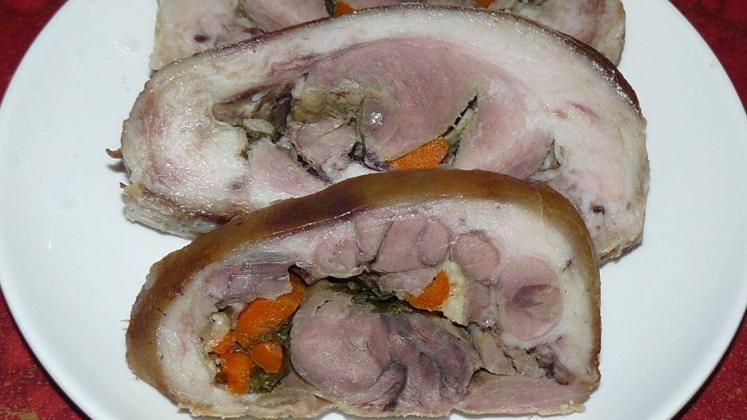 Не сложный рецепт приготовления очень вкусной фаршированной свиной рульки в духовке на праздничный стол. Ингредиенты: - свиная #рулька, - морковь, - чеснок, - петрушка, - соль и специи Способ приготовления: Свиную рульку хорошо помыть, шкуру поскрести ножом от лишней грязи. Положить в кастрюлю и варить 2,5-3 часа. Бульон посолить, можно добавить душистый перец горошком и лавровый лист. Варить на очень маленьком огне, чтобы бульон еле булькал. Отваренную рульку слегка остудить, разрезать с одной стороны и достать кость. #мясо развернуть. Морковь почистить и порезать вдоль на несколько частей, чеснок порезать крупно. Рульку хорошо поперчить, добавить молотой паприки. Разложить на ней морковь, чеснок и петрушку. Плотно свернуть и завернуть в 2-3 слоя фольги. Запечь в духовке 1 час при температуре 180-200 градусов. Поле выключения огня оставить ее #вдуховке еще на 1 час. Всё, очень вкусная фаршированная рулька в духовке готова. Но лучше положить ее на несколько часов в холодильник, чтобы о