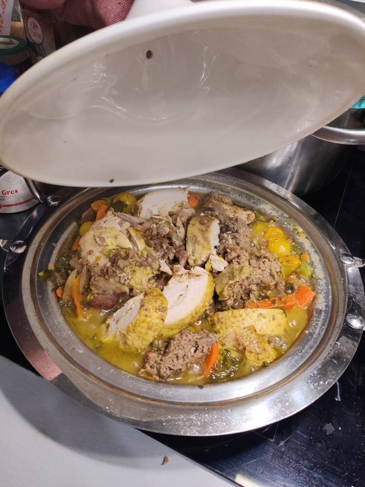 Очень удобно готовить в тажине, а если есть грудка индейки запеченная (оставшаяся от рождественского блюда ), используем ее в тажине с овощами и будет невероятно вкусное блюдо! #марроканскаякухня #французкаякухня Ингредиенты: Грудка индейки , Лук, моркови, Перец болгарский, Сельдерей, Зелень, Картошка отварная, Помидорки черри, Оливковое масло Способ приготовления: Прямо в тажине жарим лук нарезанный, добавляем морковь, перец болгарский, сельдерей и помидорки, на среднем огне 15 минут. Сверху выкладываем грудку, если есть соус (от запечённой индейки вместе с ним), выставить время 30 мин и убавить огонь. Через 20 минут добавить отварной картофель (для разогрева на пару) и немного посолить. Получится вкусный ужин! Подаём прямо в тажине !