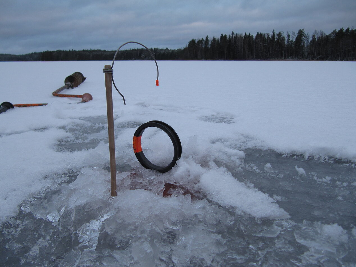 В другом варианте горловину можно вырезать из банки с винтовой крышкой и пришить наглухо. В дне и горловине прожигаются отверстия, к крышке привязывается леска 0,4 мм, к середине садка крепится грузило для его горизонтального положения на дне, к верхнему концу лески – деревянная поперечина. Для хранения живцов выбирается малопосещаемое место, желательно на водоеме с небольшим течением. Садок погружается в лунку почти полностью, в горловину переливаются живцы, закручивается крышка, и садок опускается на дно. Леска уходит под воду вся, над лункой остается только поперечина. Самое сложное – так заметить и замаскировать лунку, чтобы нашли ее только вы. Живцы хорошо живут и на некоторых озерах и прудах – в каждом случае это нуждается в отдельной проверке. Внешняя чистота и прозрачность воды абсолютно ни о чем не говорит. При извлечении садка рядом (ниже по течению) бурится лунка, леска достается багориком, отвязывается от поперечины и вытягивается. Идеальным вариантом, конечно, является наличие проруби у своего или соседского дома, что в России не редкость.
