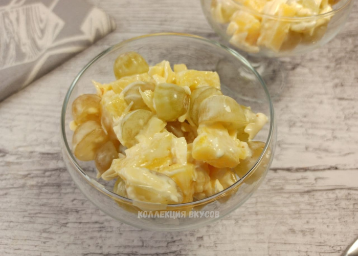 Виноград можно добавить в салат целиком (если это мелкий киш-миш). Крупные сорта винограда нужно нарезать на 2-3 части. Если виноград с косточками, их нужно удалить.